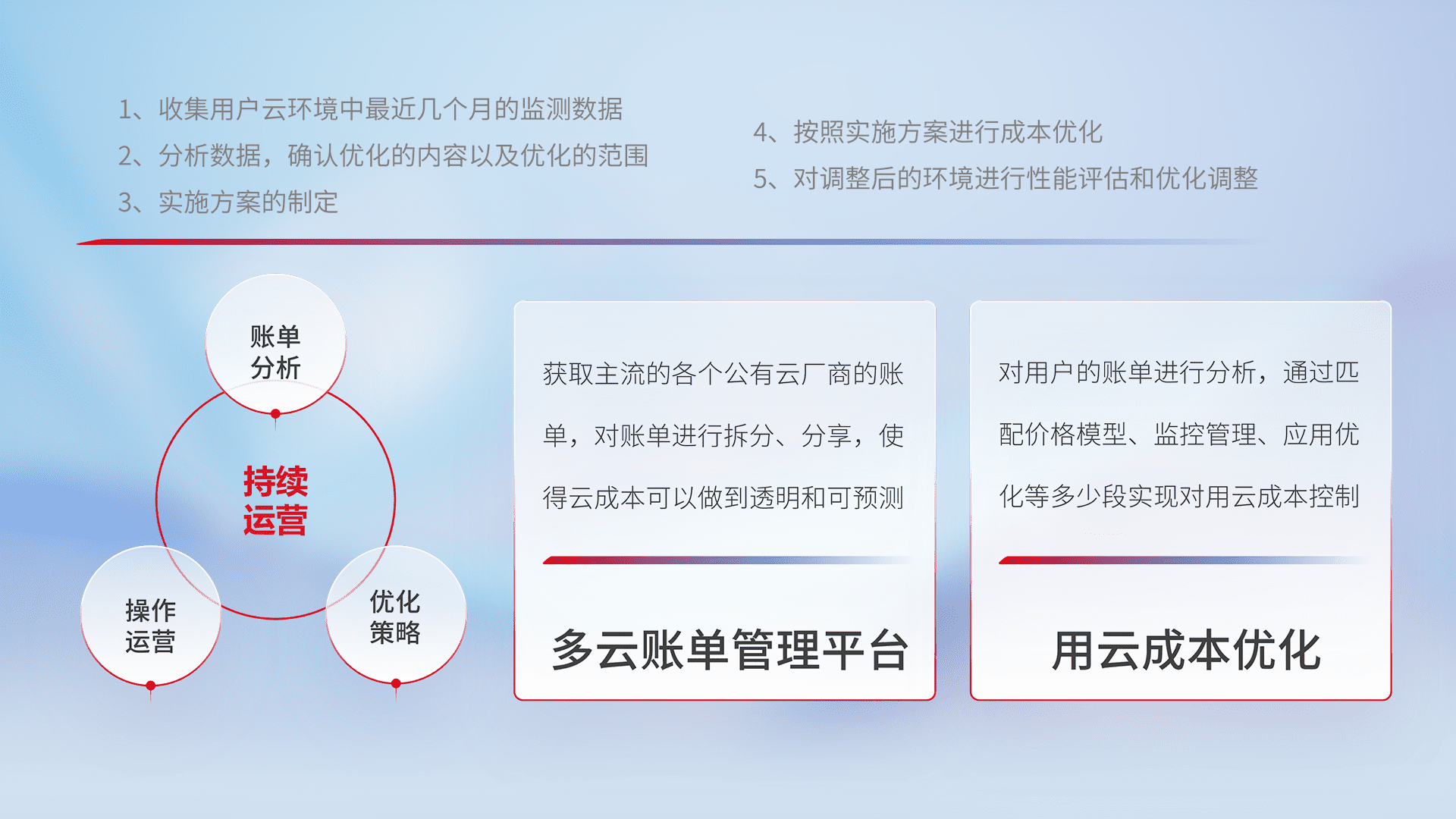通过多云纳管,,,以统一的资源数据模型把客户的云资源进行抽象和封装,,,,进而实现对多云资源的统一操作,,,保障云资源管理的可靠性、、稳定性与可用性。。。量身定制化运维内容,,,,配置、、开发运维、、、、补丁管理、、备份、、、监控、、认证和访问管理、、、审计和日常巡检等,,保障在用云过程中的可靠度,,稳定度以及高可用率。。。。